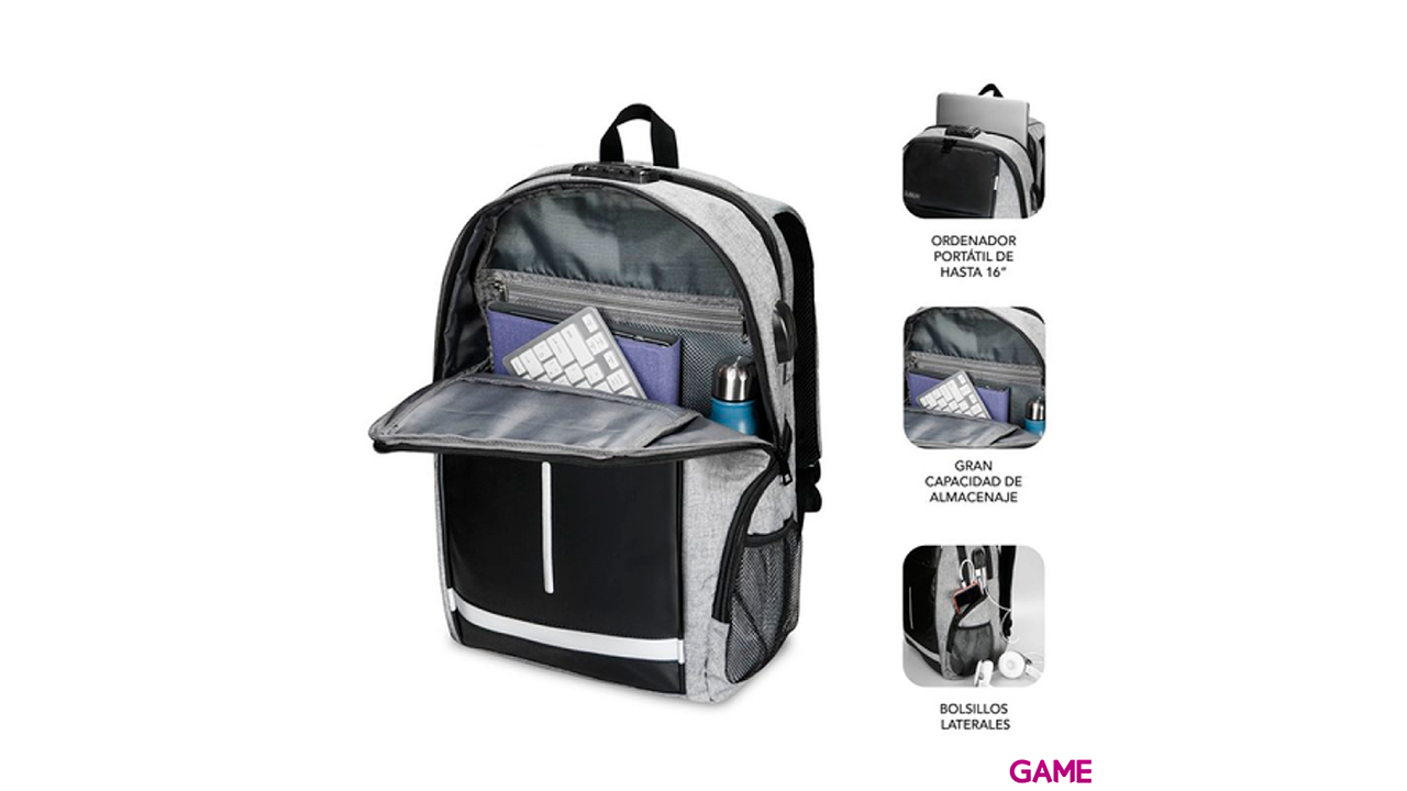 - Bolsas interiores: Bolsillo de documentos, Compartimento para bolígrafos, Compartimento para tableta, Bolsillo para lápiz USB