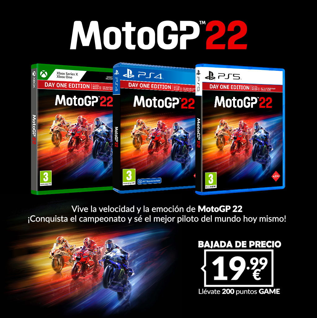Hazte ahora con MotoGP 22 Day One Edition Exclusiva GAME para PS5, PS4 o Xbox One a un precio realmente especial, por solo 19,99€. Prepárate para una increíble experiencia inmersiva de MotoGP en la historia de los videojuegos. ¡Lo real y lo virtual nunca se habían mezclado tan bien! ¡Vuelve a disfrutar uno de los campeonatos más emocionantes e icónicos de toda la historia de MotoGP! ¡17 capítulos, uno por cada Grand Prix de la temporada 2009 te están esperando! Ponte en la pies de leyendas como Rossi, Lorenzo, Stoner y Pedrosa en el pico de sus carreras.