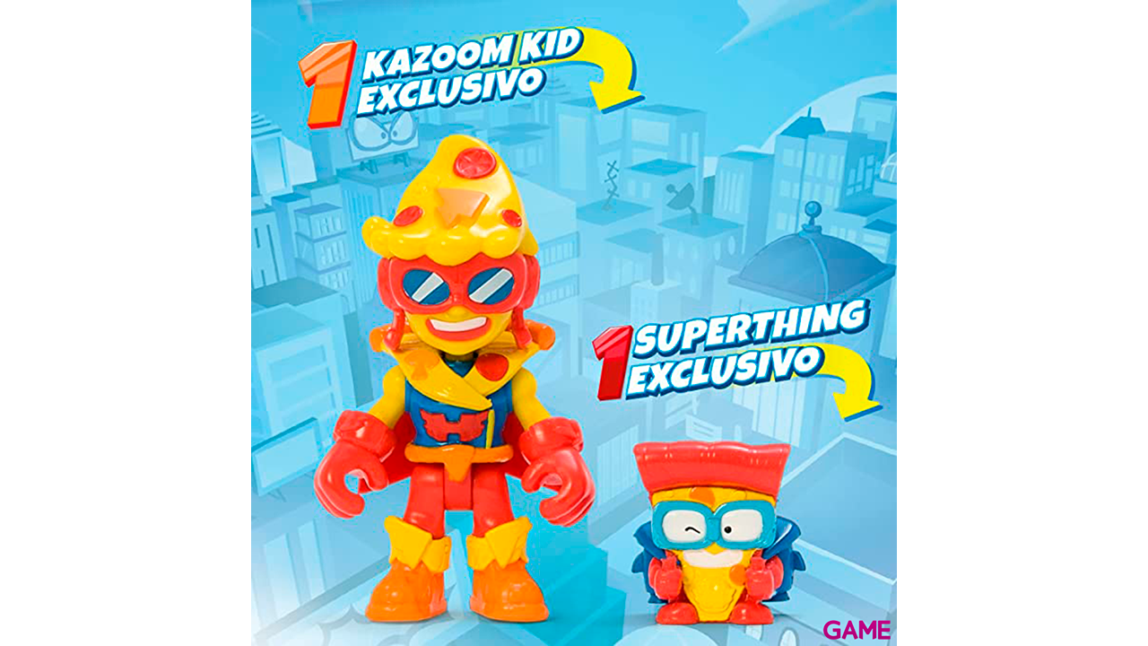 Juguete divertido con lanzador de pizzas y dos personajerñs de la serie superthings. Para los peques de la casa son divertidos, pero cuidado con las partes pequeñas.